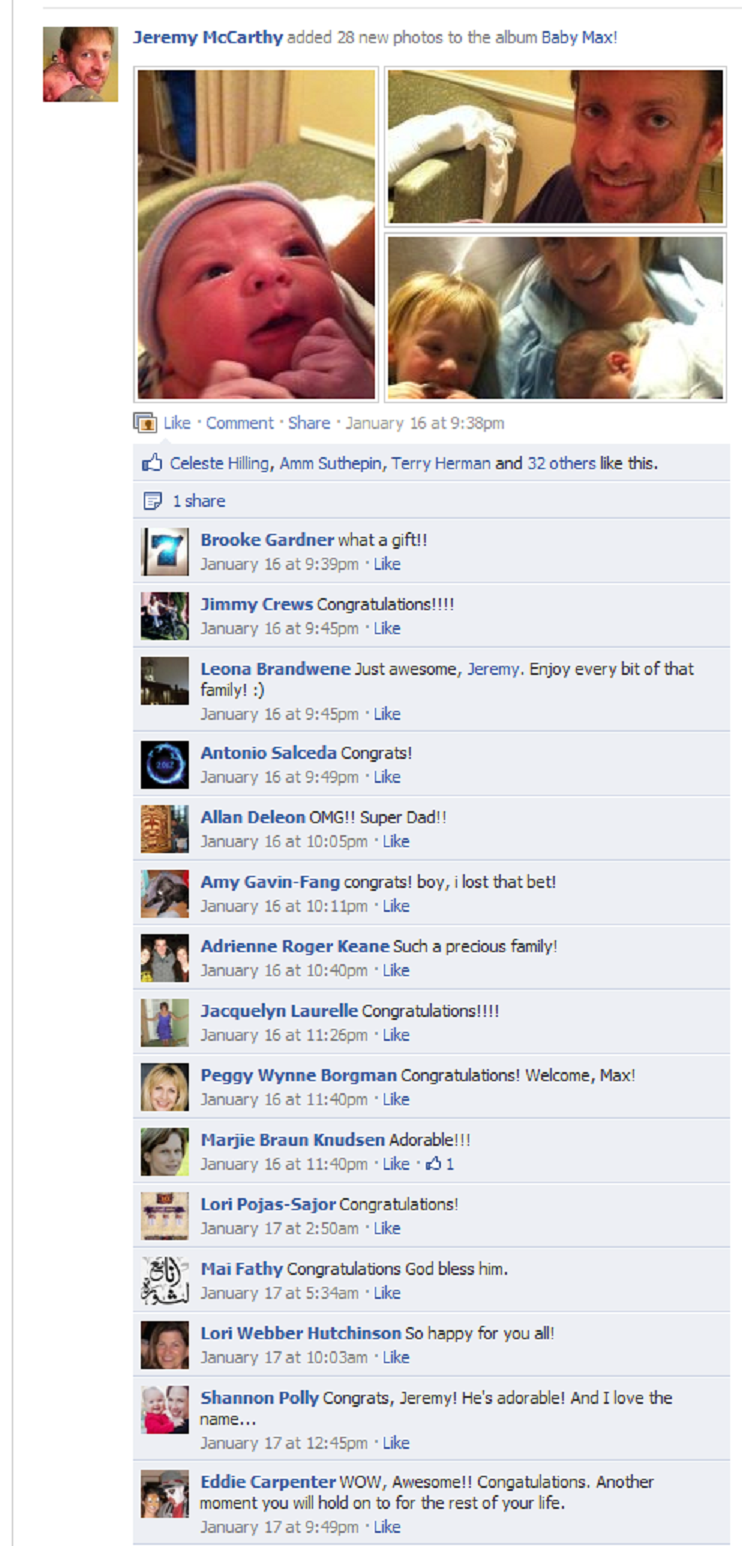 So Facebook can be a tool for negative social comparison, but it can also be a savoring machine. A place to share the best events of your life and then revel in the comments and likes from your social network. I can attest to this personally as I just gave birth to my second son and love sharing the baby pictures with my social network. It feels good to share the photos and it feels even better to see the strong positive reaction from my friends and family from around the world.